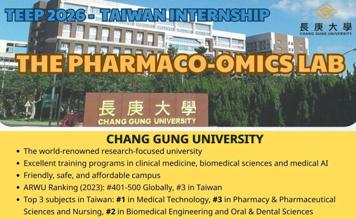 College of Medicine – Chang Gung University (CGU), Đài Loan thông báo chương trình thực tập nghiên cứu ngắn hạn định hướng học thuật dành cho sinh viên Khoa Dược, Trường đại học Tôn Đức Thắng với 05 suất học bổng do Bộ Giáo dục Đài Loan (MOE) tài trợ.